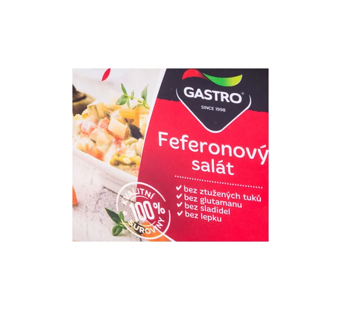 Složení :majonéza (řepkový olej, pitná voda, sušené vaječné žloutky, jedlá sůl, ocet kvasný lihový, stabilizátor: guma guar), sterilovaná zelenina (mrkev, okurky, celer, hrách, pitná voda, cukr, ocet kvasný lihový, jedlá sůl, antioxidant: disiřičitan sodný), marinovaná cibule (cibule, pitná voda, ocet kvasný lihový, jedlá sůl), sterilované feferony 5% (feferony, pitná voda, ocet kvasný lihový, jedlá sůl), cukr, jedlá sůl, konzervanty: benzoan sodný, sorban draselný..